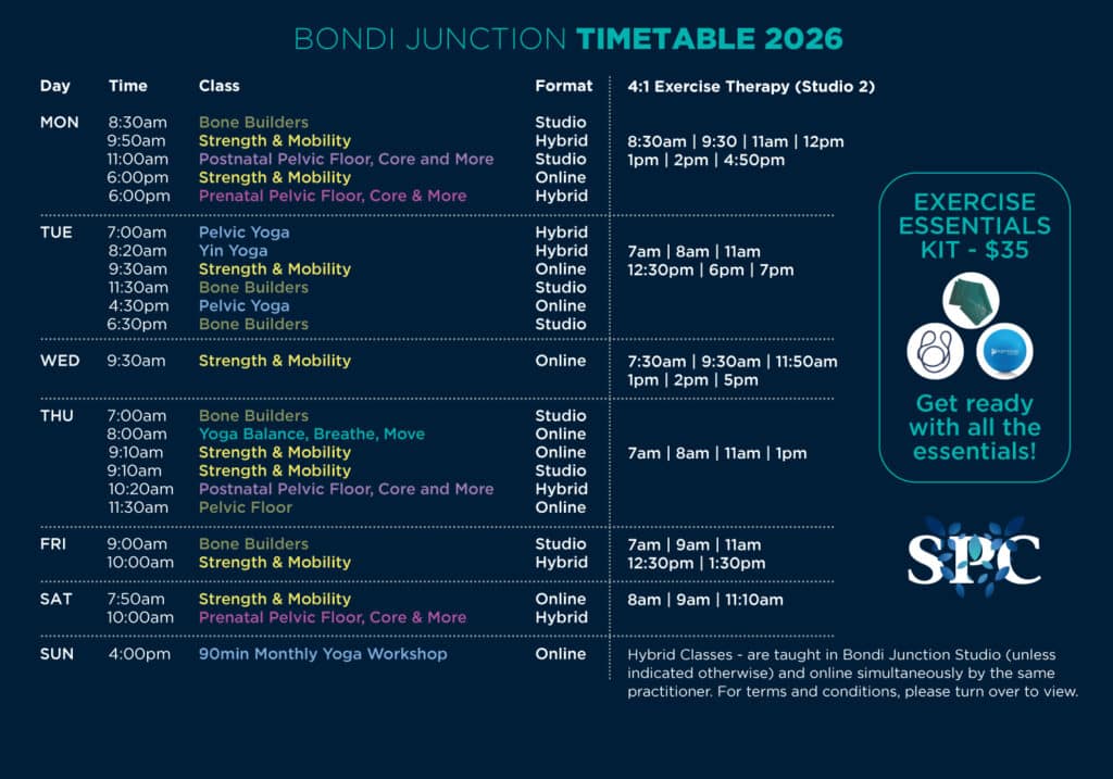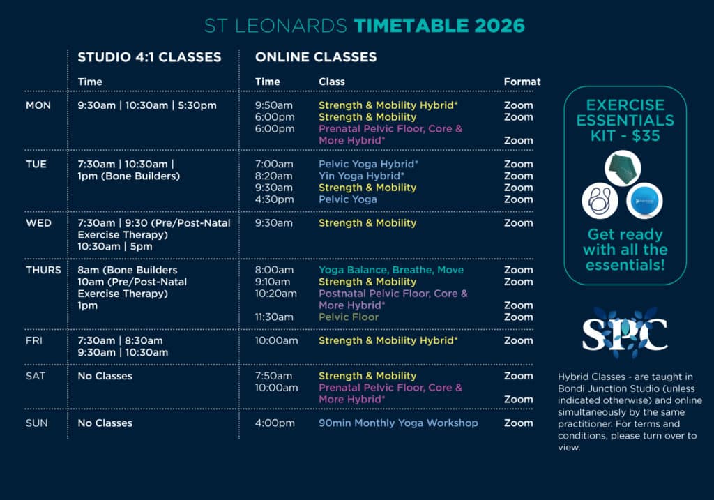 Find the perfect studio or online class time. First time clients can book an initial physio consult to get started. Please ensure you have paid for your classes with reception prior to booking into your class. Our face-to-face classes are held at two locations – St Leonards and Bondi Junction. Please see the appropriate timetable for your class: